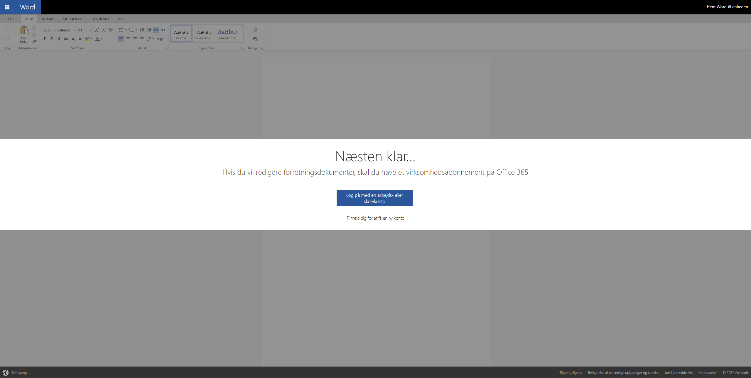 Her skal du klikke på Log på med en arbejds- eller skolekonto. Herefter skal du blot klikke på din Microsoft konto igen, og så er du klar til at se eller redigere dokumentet med Connect 365.