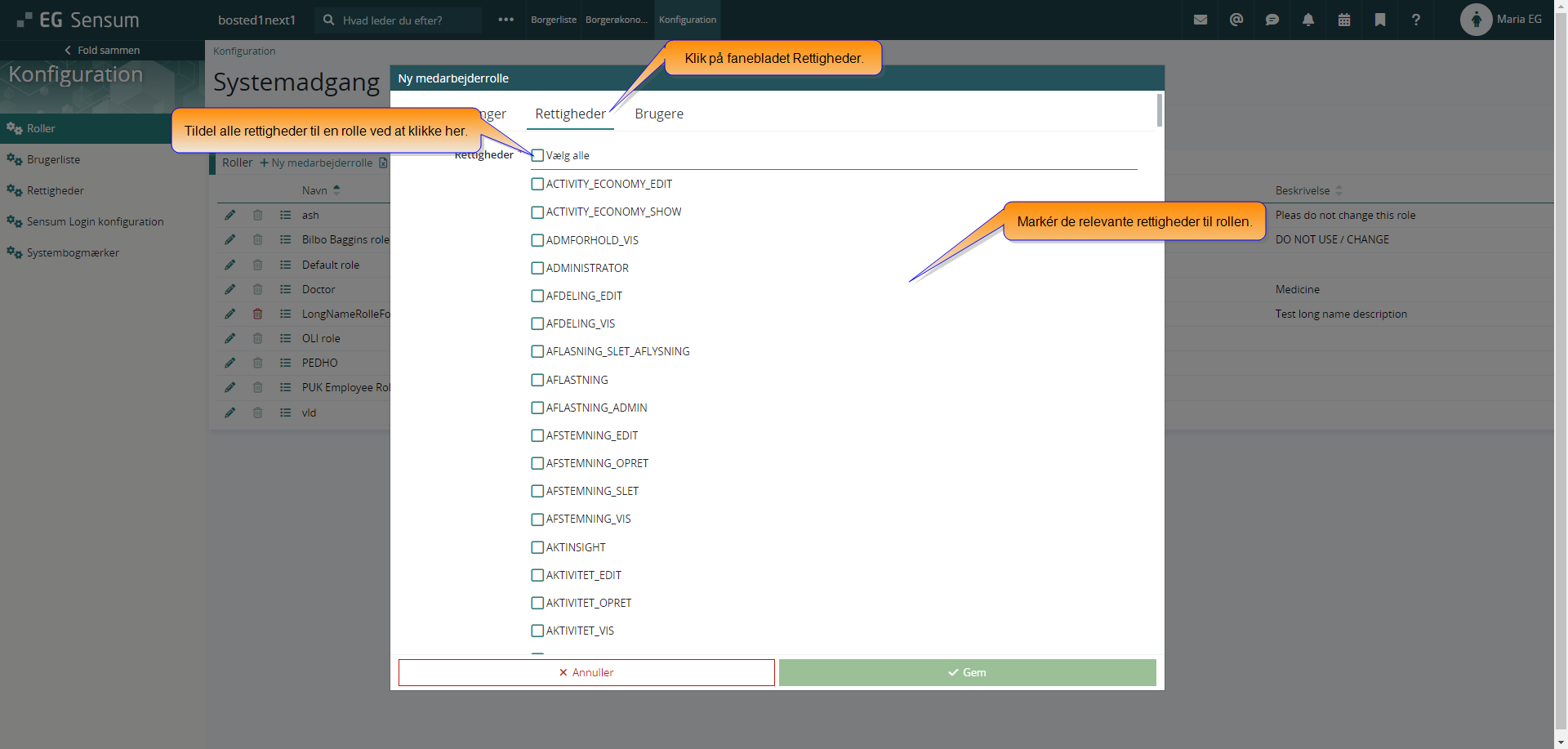 For at sikre, at systembrugerne kan bruge og konfigurere modulerne i systemet, skal du knytte rettigheder til brugernes roller. Et eksempel på en rettighed kan være "Rettighed til at redigere borgere" eller "Rettighed til at oprette leverandører". Rettighederne kan du tildele til medarbejdere med bestemte roller. Eksempler på roller kan være administrator, superbruger, medicinansvarlig eller andet, som, I selv har defineret. Rettighederne er faste og ligger i systemet, mens rollerne er nogle, I selv kan oprette.