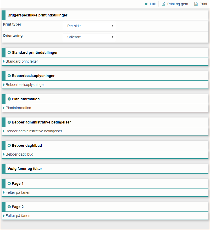 i de forskellige afsnit for at vælge de relevante felter. Eksempelvis er det muligt at udelade inaktive mål fra udskriften ved at markere afkrydsningsfeltet Print kun aktive mål i afsnittet Standard printindstillinger ligesom du kan vælge at udskrive vedhæftninger ved at markere afkrydsningsfeltet Print vedhæftninger, som også kan findes under afsnittet Standard printindstillinger.