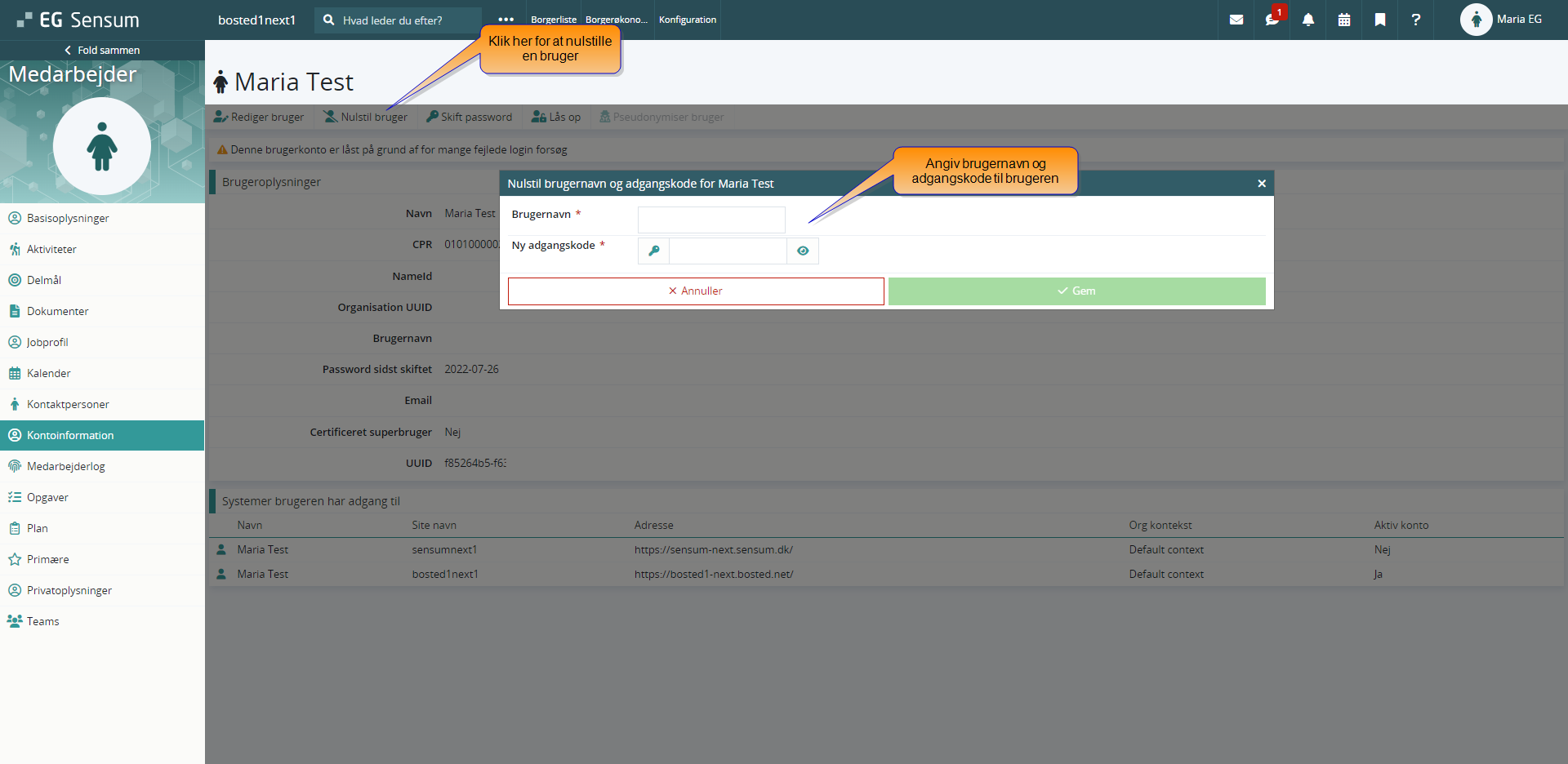 Kontoinformation muligt at nulstille en bruger. Når du nulstiller en bruger, så kan du give brugeren et nyt brugernavn og adgangskode.
