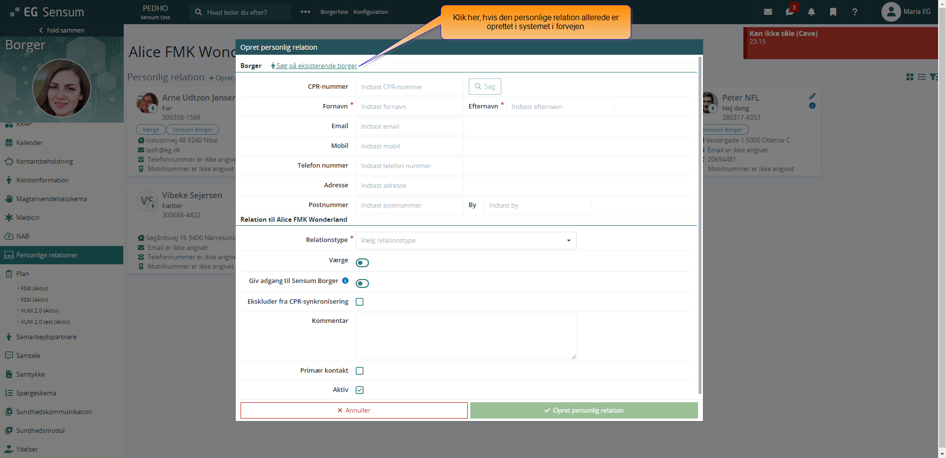 Opret personlig relation under borgerens navn. Et popup-vindue åbnes.