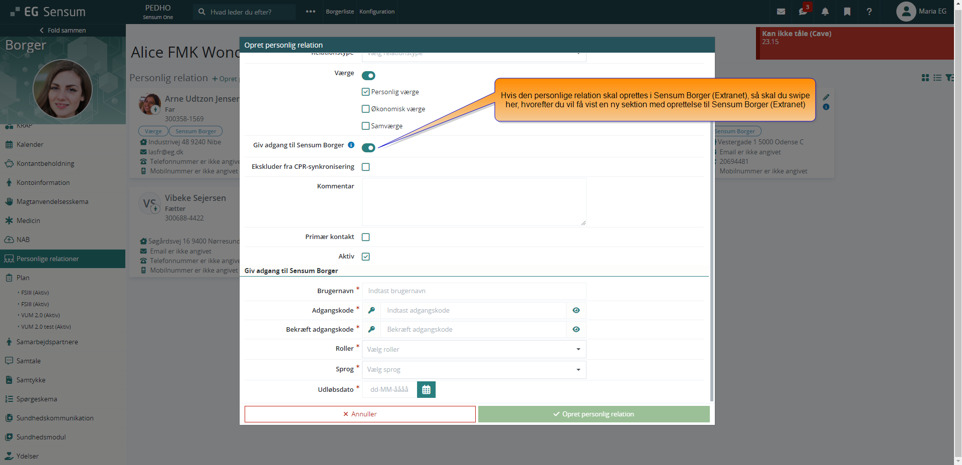 Vigtigt: Det kræver rettigheden SENSUM_ONE_EXTRANET_GRANT_ACCESS for at give en personlig relation adgang til Sensum Borger.