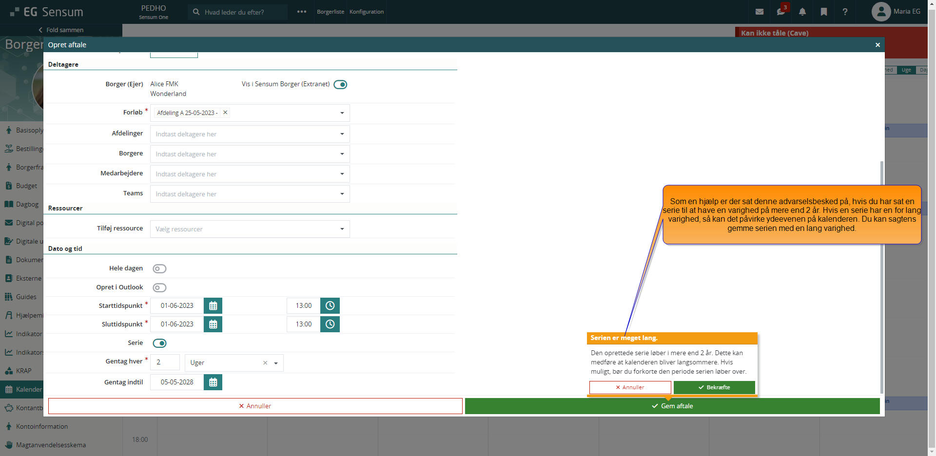 Hvis du sætter en serie til at have en varighed på længere end 2 år, så vil du blive mødt af følgende advarsel, når du gemmer begivenheden: