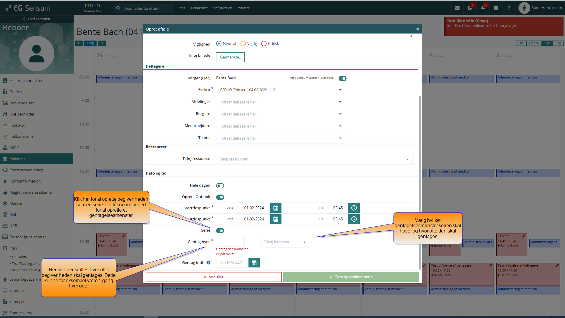 Hvis begivenheden skal være tilbagevendende med samme indhold og formål, kan du klikke på Serie. Der vil nu komme nogle nye valgmuligheder op for at oprette et gentagelsesmønster. Du kan vælge, hvor mange gange begivenheden skal gentage sig, eksempelvis 10 gange, eller du kan vælge en slutdato for, hvornår serien skal slutte. Hvis du ikke vælger en slutdato, vil begivenheden automatisk få slutdato om 365 dage.