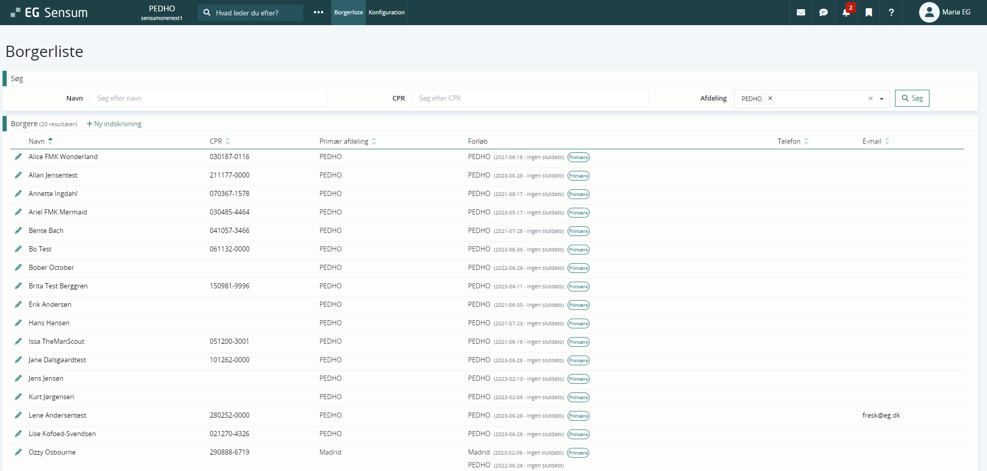 Du kan nemt og hurtigt få et overskueligt overblik over de borgere, der er oprettet i din organisatoriske kontekst, på borgerlisten. Her kan du se borgerens navn, afdeling, telefonnummer, e-mail og CPR-nummer. Fra borgerlisten er det ligeledes muligt at oprette en ny borger. Borgere vil kun blive vist i listen, hvis der er under 500 borgere. Hvis der er over 500 borgere på listen, så skal du bruge søgefunktionerne til at få borgerne frem.