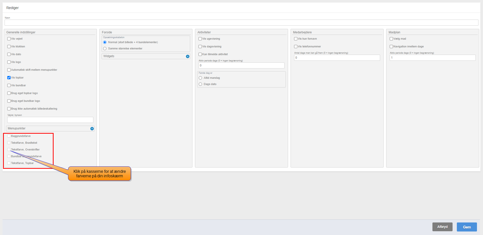 Du kan tilpasse farverne på din infoskærm, således skærmen får det udtryk, du ønsker. Du kan gemme dine indstillinger og vise skærmen løbende, så du har overblik over, hvordan valget af farver, vil se ud på infoskærmen.
