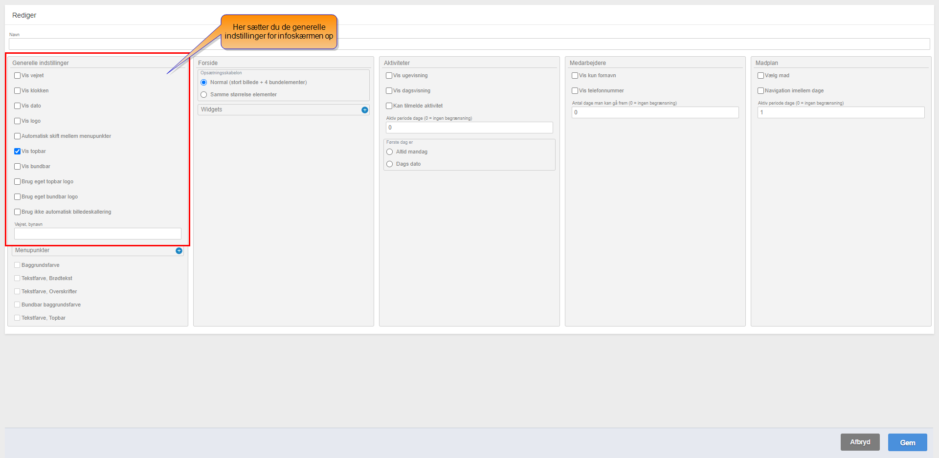 De generelle indstillinger ved opsætning af en infoskærm omhandler primært skærmens ydre layout og visning af generelle informationer.