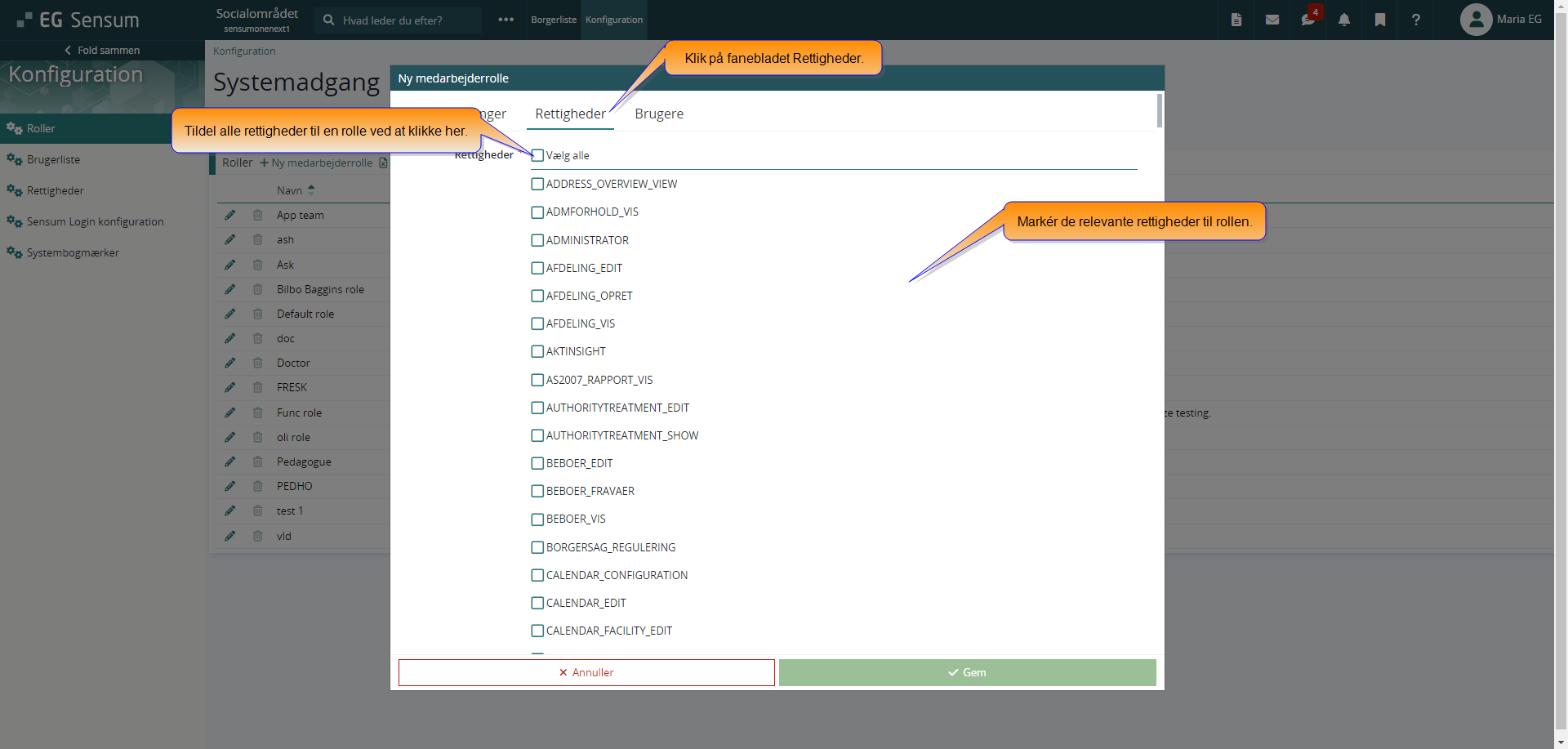 I konfigurationen kan du oprette forskellige roller, der definerer, hvilke rettigheder de forskellige grupper af systembrugere har. Medarbejdere med administratorrettigheder kan oprette et hvilket som helst antal roller.