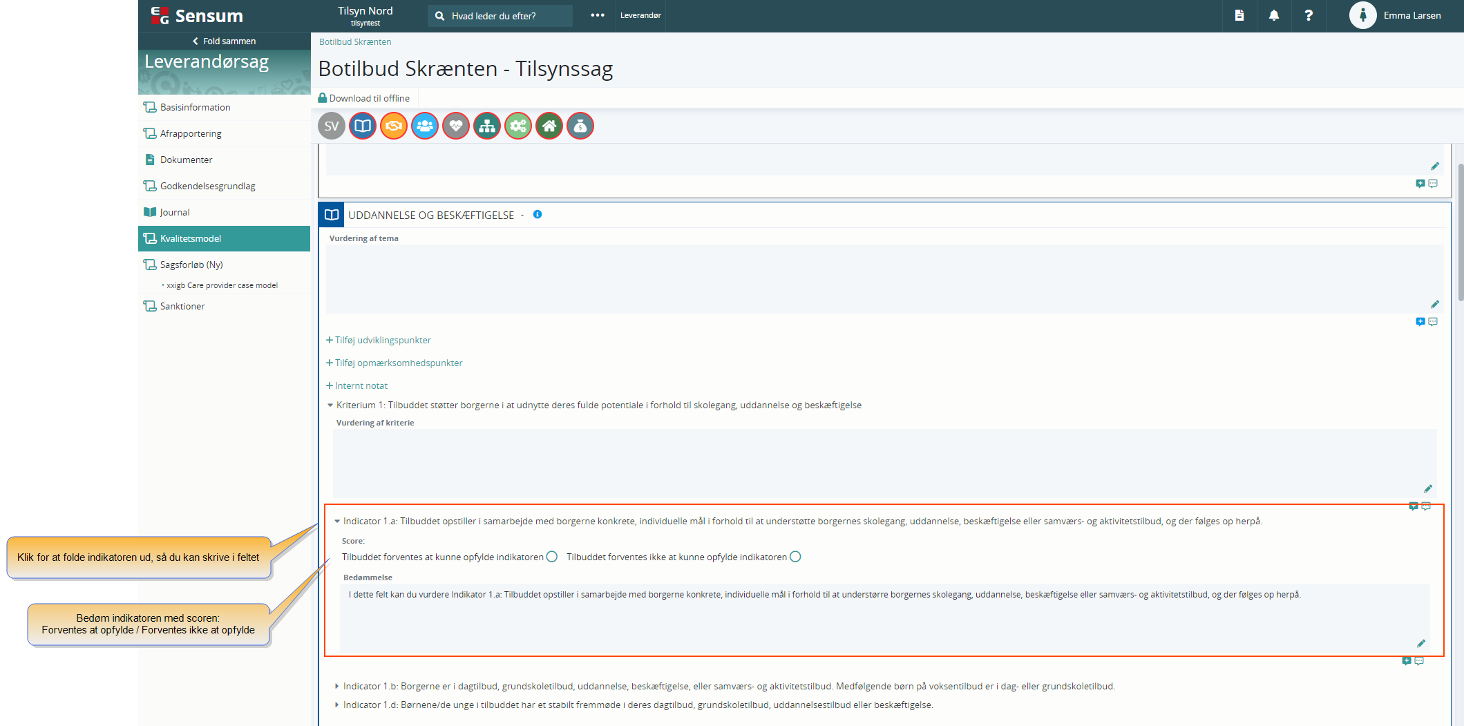For hvert kriterium er der en eller flere indikatorer, der hver har et felt til vurdering. Dette udfyldes på samme måde som et tema og kriterium med fritekst.